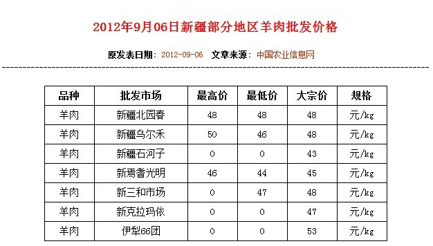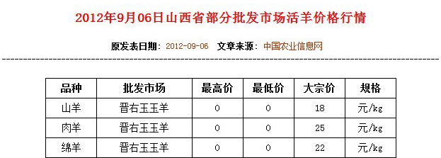 各地活羊價(jià)格行情(2012/9/6)