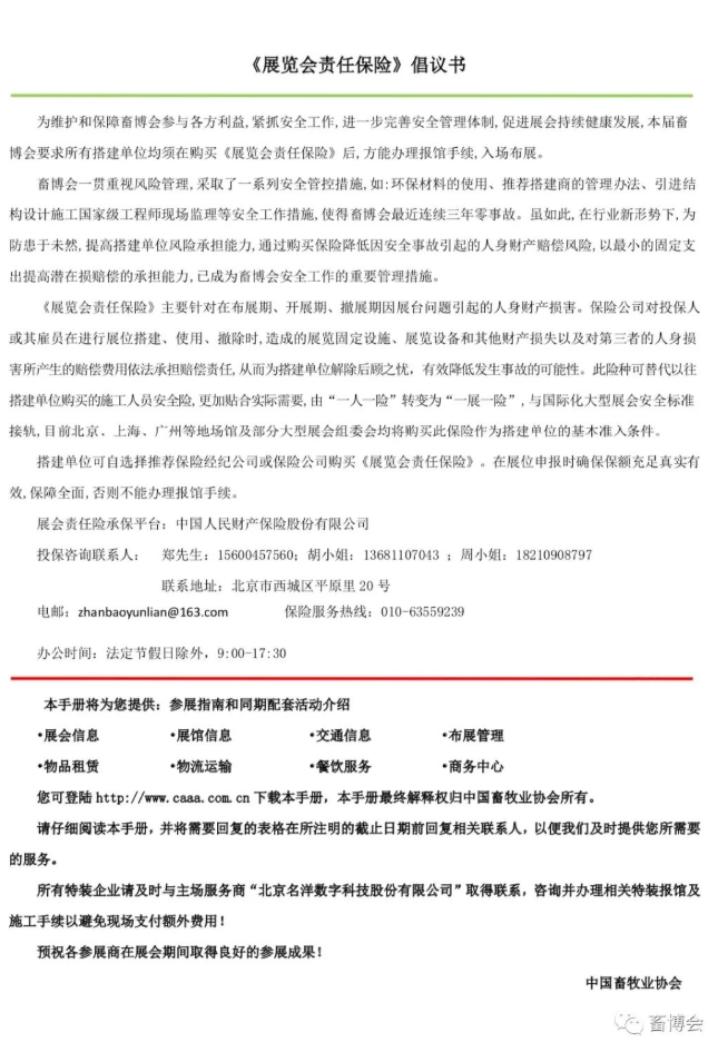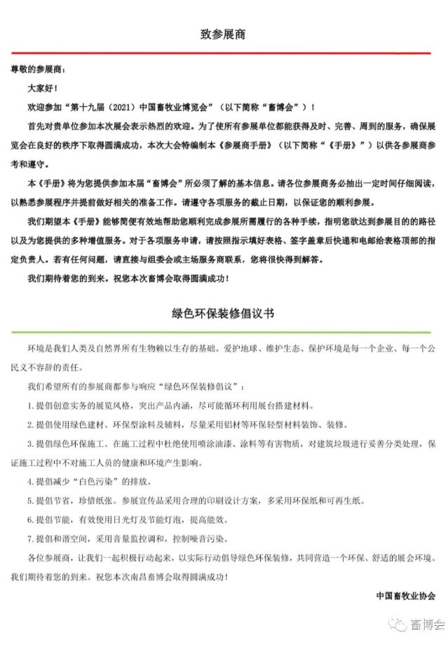 大家好!歡迎參加“第十九屆(2021)中國畜牧業(yè)博覽會(huì )”(以下簡(jiǎn)稱(chēng)“畜博會(huì )”)!首先對貴單位參加本次展會(huì )表示熱烈的歡迎。為了使所有參展單位都能獲得及時(shí)、完善、周到的服務(wù),確保展覽會(huì )在良好的秩序下取得圓滿(mǎn)成功,本次大會(huì )特編制本《參展商手冊》(以下簡(jiǎn)稱(chēng)“《手冊》”)以供各參展商參考和遵守。本《手冊》將為您提供參加本屆“畜博會(huì )”所必須了解的基本信息。請各位參展商務(wù)必抽出一定時(shí)間仔細閱讀,以熟悉參展程序并提前做好相關(guān)的準備工作。請遵守各項服務(wù)的截止日期,以保證您的順利參展。《參展商手冊》詳細內容請點(diǎn)這里或“閱讀原文”查看。